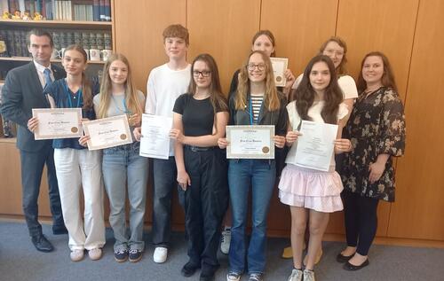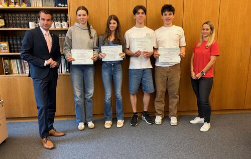 Fünf fitte Französisch-Schülerinnen und -Schüler der Jahrgangsstufen 9,10 und Q1 freuen sich zum Schuljahresende über ihre DELF-Diplome. Maxim Eufinger (9a), Philipp Weber (10c), Franka Bracht (Q1), Dana Leugner (Q1) und…