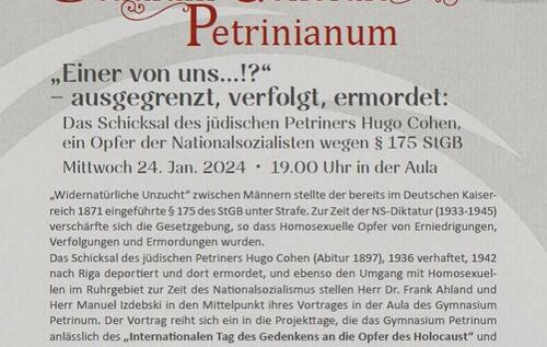 Bei uns hier am Petrinum findet aktuell im Gedenken an den Holocaust eine Projektwoche zu diesem Thema statt. Schüler und Schülerinnen haben sich für diesen Zeitraum in 30 Projektgruppen aufgeteilt, um in diesen zu verschiedenen…