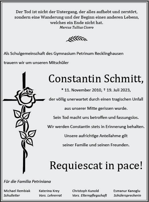 Als Schulgemeinschaft des Gymnasium Petrinum Recklinghausen trauern wir um unseren Mitschüler