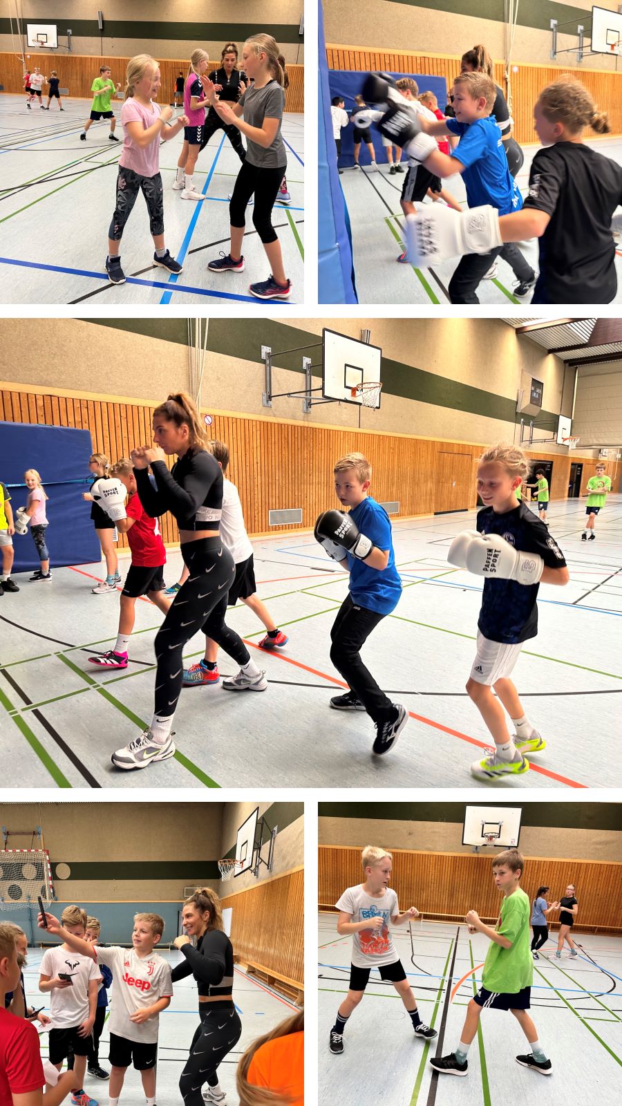 Aktuell arbeitet sie eng mit dem Gleichstellungsbüro Dortmund an einem Konzept, wie Frauen und Mädchen durch Sport und Selbstverteidigung gestärkt werden können. Unsere Schülerinnen und Schüler erlebten ein anderthalbstündiges, intensives Boxtraining, das alle fünf motorischen Fähigkeiten – Kraft, Ausdauer, Beweglichkeit, Schnelligkeit und Koordination – herausforderte und verband. Von Laufen über Seilspringen bis hin zu Sit-Ups absolvierten die Kinder eine Vielzahl an Übungen. Doch das Highlight war zweifellos das Tragen der Boxhandschuhe und das Boxen gegen eine Sprungmatte – jedoch nicht ohne zuvor die richtige Technik und Verteidigung geübt zu haben.