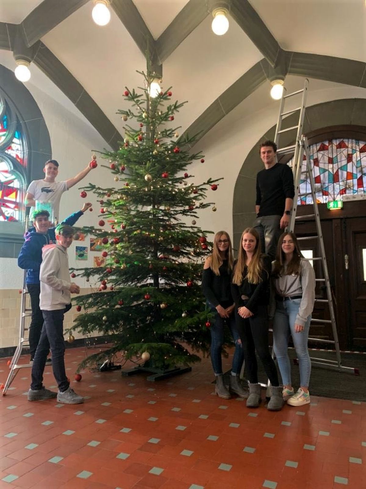 ... pünktlich zu Beginn der Adventszeit schmückt ein stattlicher Weihnachtsbaum die Eingangshalle zum Altbau und lässt sie in warmem Licht erstrahlen. Herzlichen Dank an unseren Hausmeister, der den Baum aufgestellt und uns die Leitern zur Verfügung gestellt hat, und an alle engagierten Helfer.Wir wünschen der ganzen Schulgemeinschaft eine wunderbare Adventszeit.