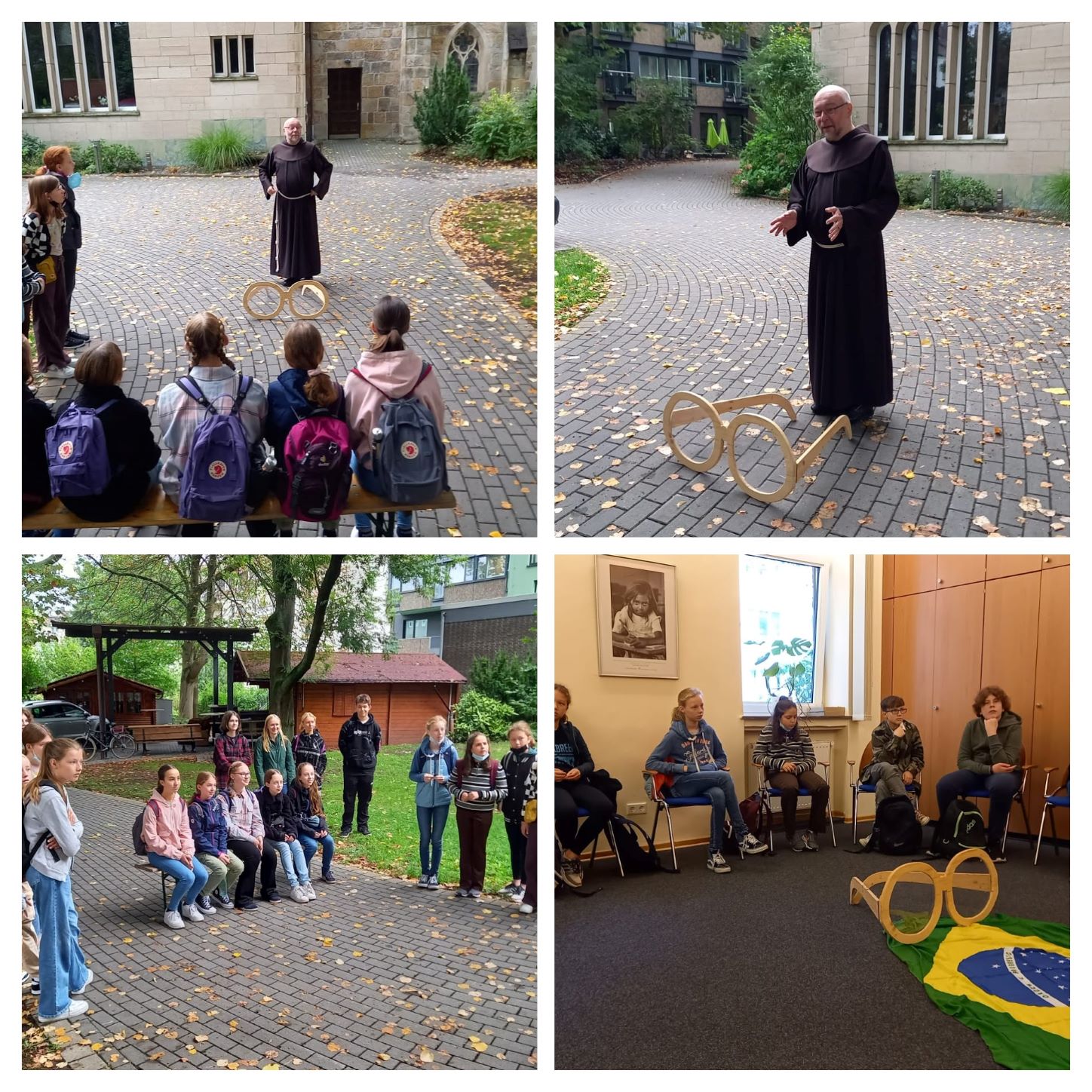Anliegen des Franziskanerordens ist nämlich, sowohl die ‚nahen Nächsten‘ – z.B. die Obdachlosen in Dortmund –, als auch die ‚fernen Nächsten‘ – wie die Schüler unserer Partnerschule CONASA in Bacabal – nicht aus dem Blick zu verlieren. Nach unserem Spaziergang durch den Garten versammelten wir uns im Kloster selbst. Nach einer Vorstellungs- und Fragerunde, in der uns Bruder Augustinus unter anderem Fotos von seinem letzten Besuch in Brasilien im Sommer 2022 zeigte, gab es für alle einen kleinen Imbiss im Garten. Hier konnten viele von uns noch persönlich mit Bruder Augustinus ins Gespräch kommen.