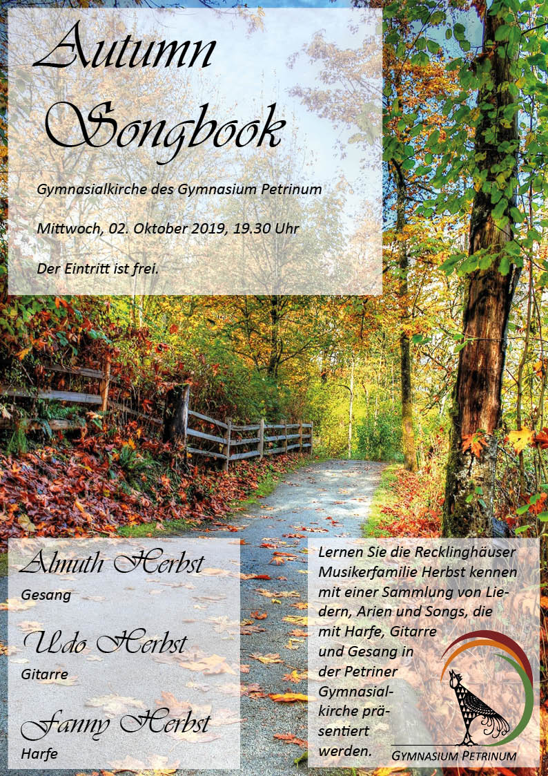 Gitarrist Udo Herbst (Abi 1975 am Petrinum) präsentiert gemeinsam mit seiner Frau Almuth (Gesang) und seiner Tochter Fanny (Harfe) eine herbstliche Auswahl von Lieder, Arien und Songs. Das familiäre Zusammenspiel von Gesang, Gitarre und Harfe lässt den Herbst in allen seiner Schönheit und seinem Facettenreichtum erlebbar werden. Der Eintritt ist frei.