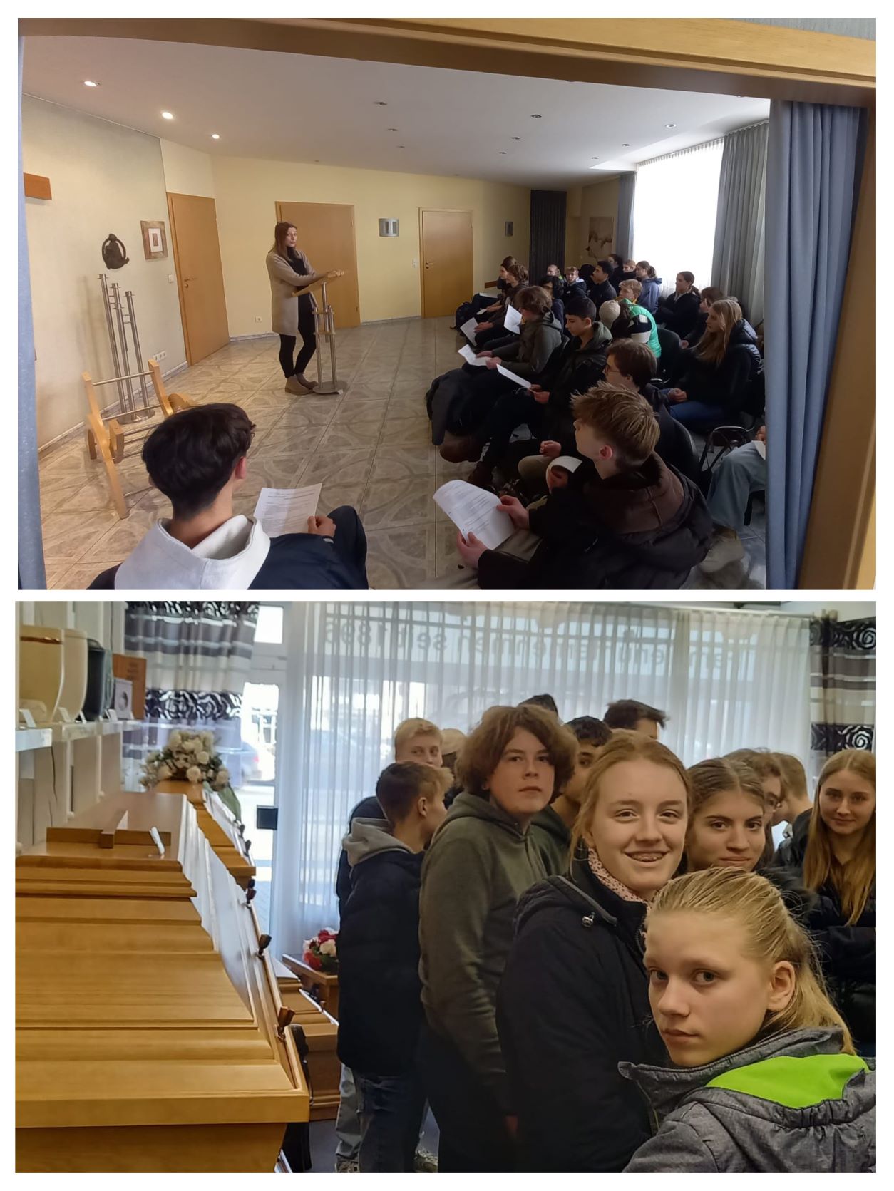 Im Namen unseres Unterrichtsthemas „Abschied nehmen – Umgang mit Trauer und Leben nach dem Tod“, hat sich der katholische Religionskurs der Klassen 9b&c gemeinsam mit Herrn Willebrand am vergangenen Dienstag, den 14. Februar 2023 auf den Weg zum naheliegenden Bestattungsinstitut Konert gemacht, um einen Einblick in die Aufgabenbereiche eines Bestatters zu erhalten. Wir wollten erfahren, wie denn der Bestatter selbst mit dem Tod im Alltag zurechtkommt und wie es ist, Tag für Tag mit dem Sterben konfrontiert zu werden. Des Weiteren wollten wir erfahren, was genau mit dem Leichnam geschieht, wie genau dieser auf die Bestattung vorbereitet wird und welche Möglichkeiten man als Angehöriger hat. Nachdem wir von der Mitarbeiterin Frau Wennig, welche seit fünf Jahren für die Familie Konert und ihren Betrieb arbeitet, willkommen geheißen wurden, erklärte sie uns zunächst einiges über ihren Alltag als Bestatterin.