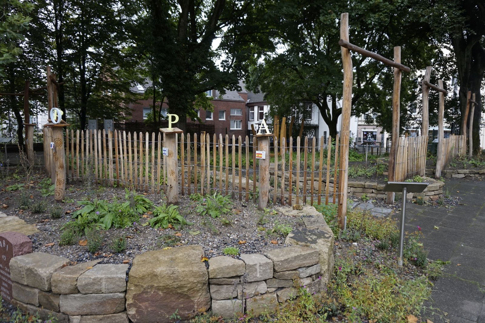 Der Schulgarten selbst, der in den vergangen Jahren stets verschlossen war und ein eher tristes, da verwildertes Dasein fristete, wurde im vergangenen Jahr unter fachkundiger Planung und Anleitung von Barbara Noga, die mit ihre Firma Garten Design Noga auf die nachhaltige und pädagogisch sinnstiftende Gestaltung von Gärten und Außenanlagen spezialisiert ist, von Grund auf neu gestaltet. In mehreren Projekttagen haben viele Mitglieder der Schulgemeinschaft, Schülerinnen und Schüler, Eltern, Lehrerinnen und Lehrer sowie Ehemalige teils bei frostigen Temperaturen und teils in schweißtreibender Hitze gemeinsam angepackt, um den Schulgarten zu einem nachhaltigen Erlebnisgarten, zu einem ganz neuen pädagogischen Raum, zu einem neuen Schmuckstück unserer Schulhofs werden zu lassen. Insektenhotels, eine Insektenburg, eine Wassersenke, Sitzbänke, Hochbeete, Natursteinmauern, Pflanzen, Bäume, ein Spiel- und Klettergerät, ein grünes Klassenzimmer, Erläuterungstafeln zur Flora und Fauna, ein Europa-Garten, in dem unserer Partnerschule verewigt sind, ein Natursteinmosaik im Eingangsbereich, das den Petriner Hahn mit seinen bunten Schwanzfedern zeigt, oder eben die historischen Tafeln zur Bildungsgeschichte und vieles mehr – an jeder Ecke im neuen Schulgarten gibt es etwas zu entdecken.