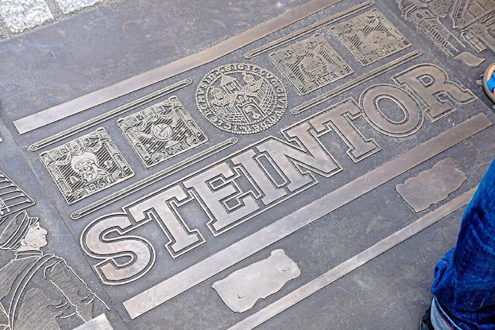 Nach Viehtor und Martinitor hat jetzt auch das Steintor eine Bronzeplatte: Die Tafel, die in den Boden eingelassen wurde, markiert einerseits das ehemalige Stadttor, andererseits weist sie auf die Geschichte Recklinghausens als Bildungsstadt hin.