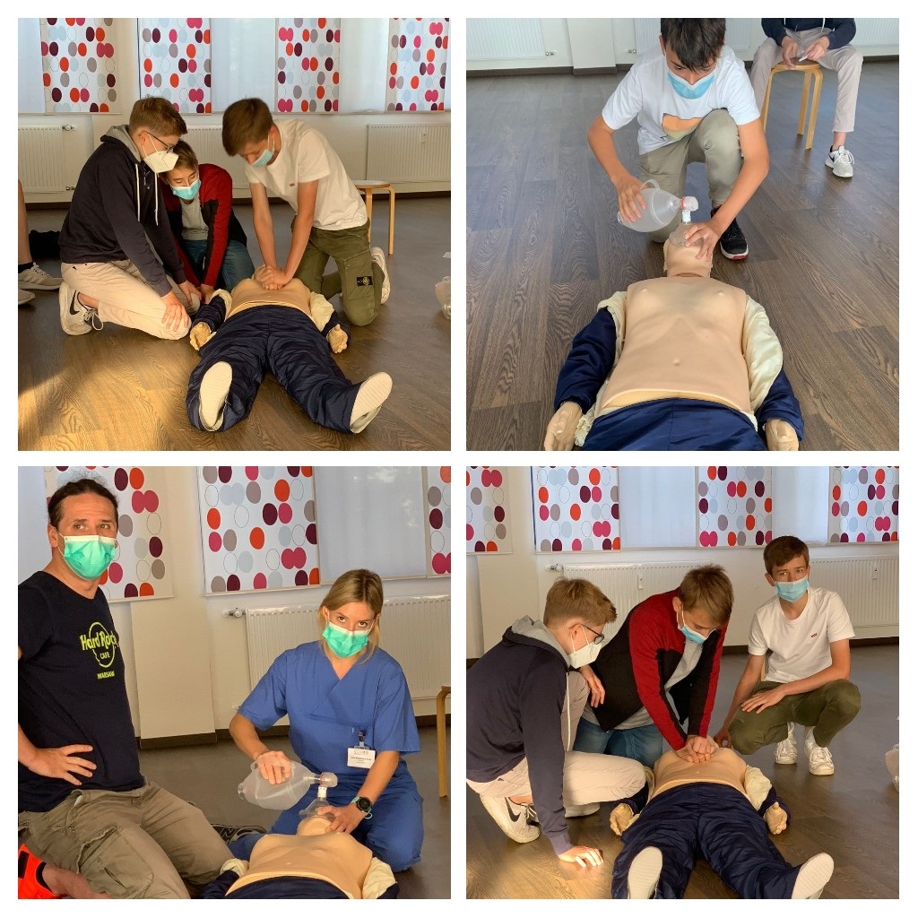Nachdem unsere 26köpfige Klasse ankam, wurden wir in Gruppen eingeteilt. Ich wurde einer Gruppe von neun Mädchen, einer Anästhesistin und einer Anästhesie-Schwester zugeteilt. Wir gingen in einen gesonderten Raum, auf dessen Boden eine Puppe aus Gummi lag, an der wir das "wiederbeleben" erlernen sollten. Nach einigen kurzen Anweisungen ging das erste Zweierteam zur Reanimation über, dem wir gespannt und noch etwas gehemmt zuschauten. Zwei MInuten aktive Herzdruckmassage, bis die zweite Person ablöste. Einige Male knackte die Puppe, was bei einem echten Menschen eine gebrochene Rippe bedeuten würde, aber lieber eine gebrochenen Rippe als ein Leben weniger, erklärte uns die Anästhesistin.