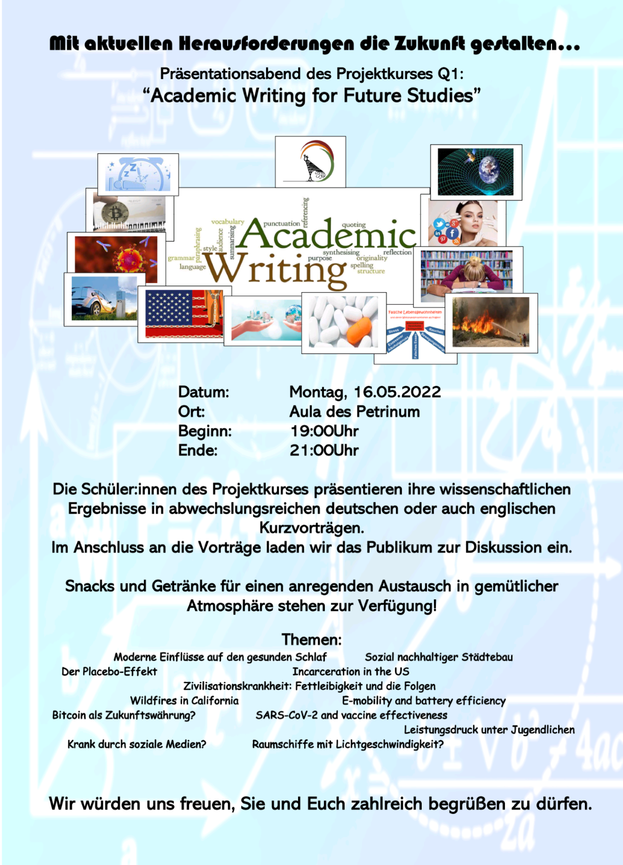 „Fliegen mit Lichtgeschwindigkeit?“, „Bitcoins als Währung der Zukunft?“, “E-Mobility and Battery Efficiency“, „Nachhaltige Stadtentwicklung“, “Incarceration in the USA“,... sind nur einige der zahlreichen Themen, mit denen sich die Schüler:innen des Projektkurses „Academic Writing“ der Stufe Q1 im Rahmen ihrer Projektarbeiten wissenschaftlich auseinandergesetzt haben. Die Ergebnisse ihrer umfangreichen Arbeiten (durch intensive Recherche, quantitative Erhebungen oder Experteninterviews) werden die zwölf Schüler:innen beim anstehenden Präsentationsabend allen Interessierten in deutschen aber auch englischen Kurzvorträgen vorstellen. Zu diesem (hoffentlich) spannenden und erkenntnisreichen Abend möchten wir Sie und Euch ganz herzlich einladen, und zwar am...