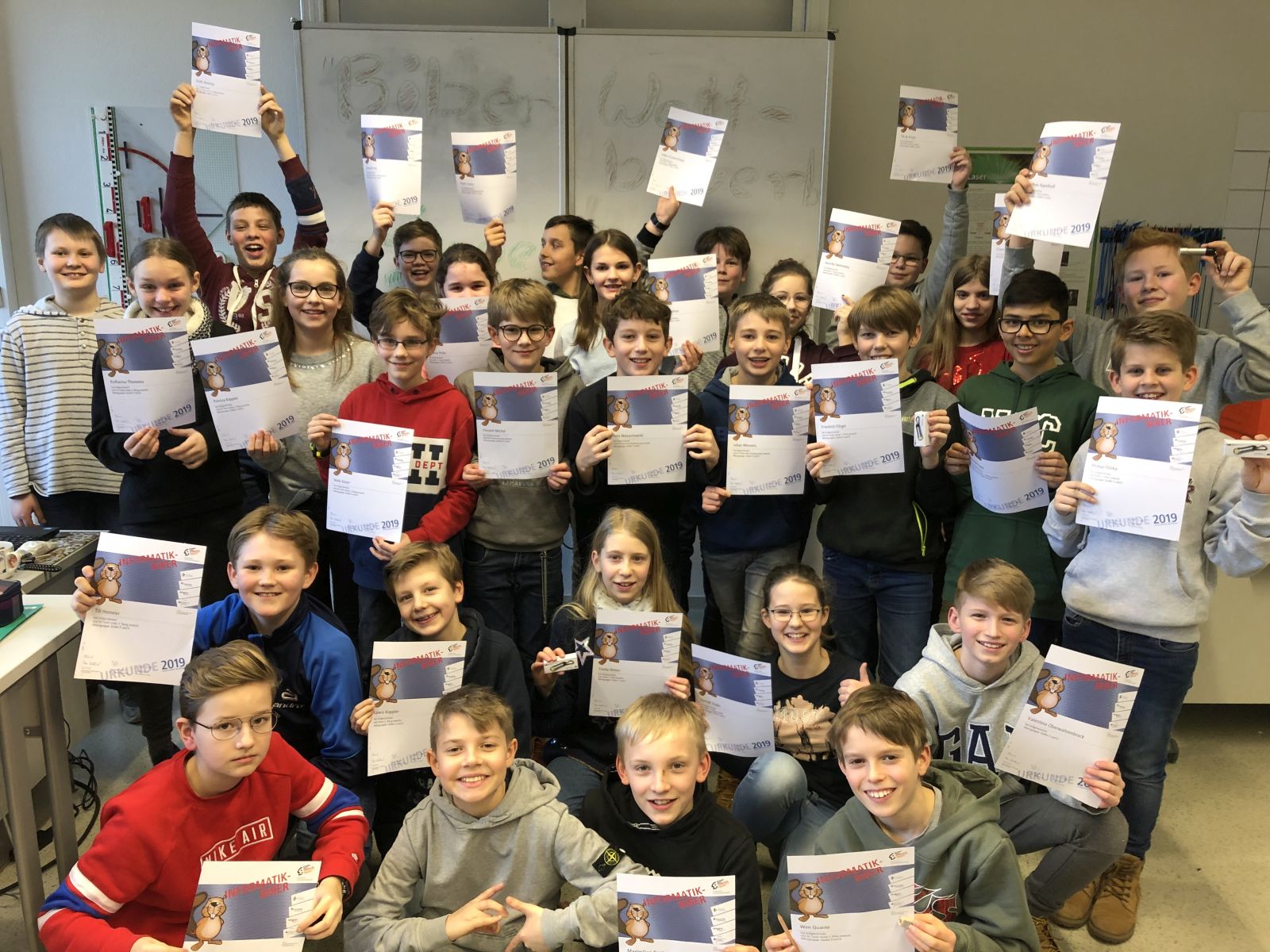 Im November letzten Jahres nahmen die Teilnehmerinnen und Teilnehmer des Sciences-Kurses der School of Talents an dem Biber-Wettbewerb teil. 40 Minuten standen den Schülerinnen und Schülern für 15 Fragestellungen zur Verfügung. Die Themen waren lebensnah und aktuell, die Bearbeitung vielfach interaktiv. Die Kinder konnten bei einigen Fragestellungen direkt sehen, wie sich ihre Ideen auf die Lösung auswirken, so zum Beispiel bei der Frage, wie der richtige Weg einer Kugel im 3-D-Labyrinth aussieht. Da dieser Wettbewerb keinerlei Vorkenntnisse verlangt, sondern allein mit logischem und strukturellem Denken zu bewältigen ist, eignet er sich hervorragend als Einstieg zur Auseinandersetzung mit der Informatik. Insgesamt haben 401.737 Schülerinnen und Schüler bundesweit teilgenommen.
