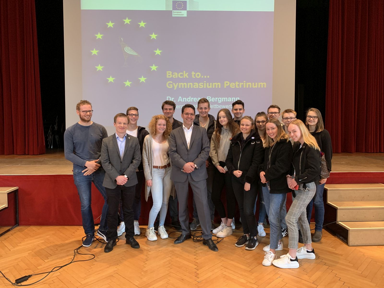 Eingeleitet durch den inzwischen dritten Besuch des ehemaligen Petriners Herrn Dr. Bergmann von der Europäischen Kommission für Wettbewerb am 17.05.2019 bis zur Analyse der Ergebnisse der Juniorwahl Europa am 27.05.2019 stand das Petrinum ganz im Zeichen Europas und der Demokratie.