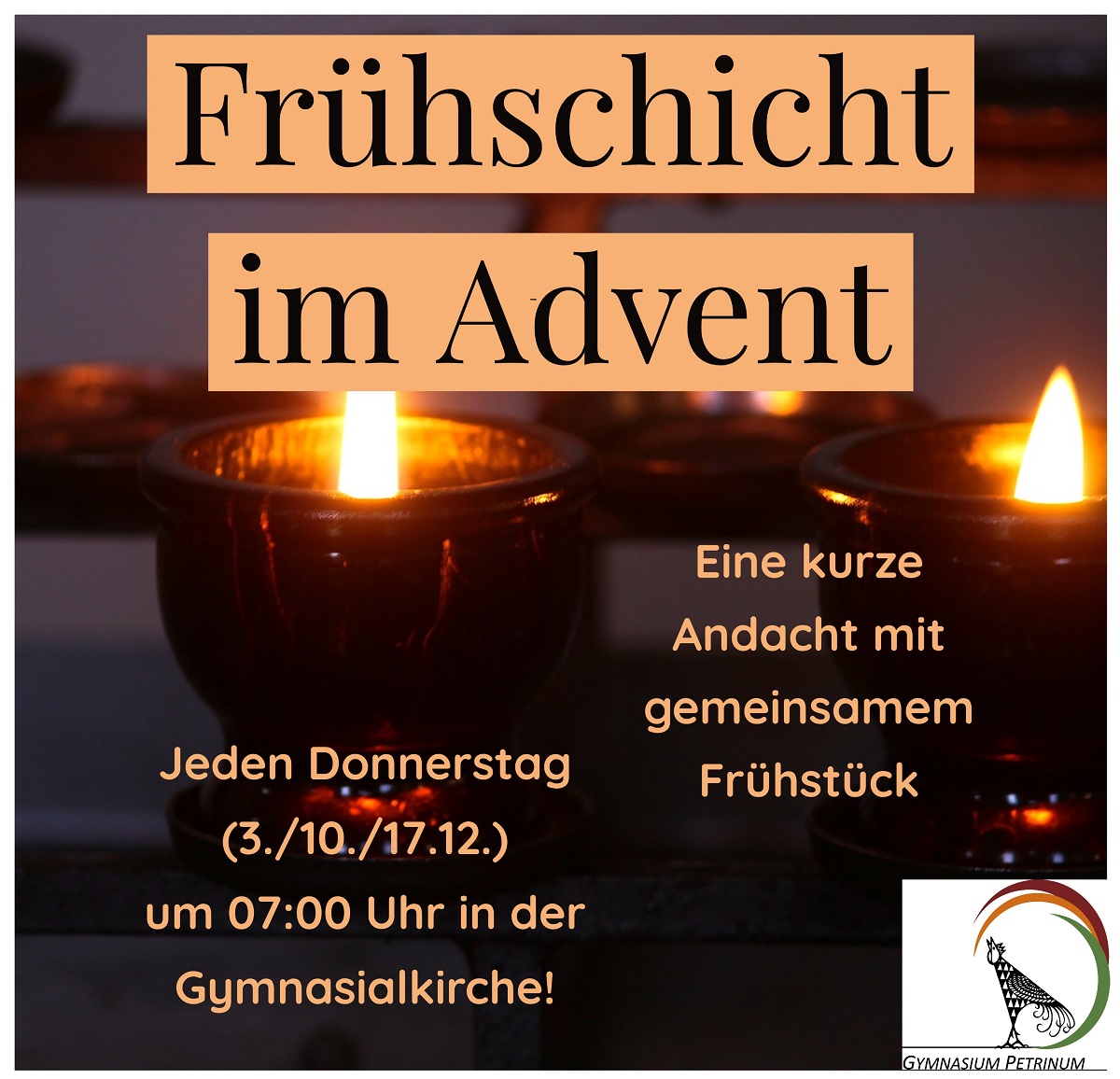 Eine Möglichkeit, diese besondere Zeit im diesem besonderen Jahr auch im Rhythmus der Woche wahrzunehmen, sind die Frühschichten im Advent: Gemeinsam mit dem Areopag feiern wir am Petrinum jeden Donnerstag in der Adventszeit um 7.00 Uhr in der Gymnasialkirche eine kleine Adventsandacht mit passenden Texten, Gedanken und Gebeten - Frühaufsteher werden also mit einer ganz besonderen Atmosphäre belohnt!
