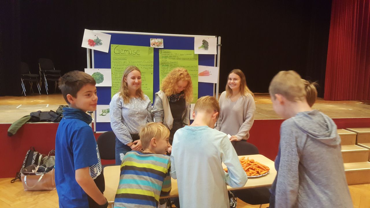„Der Tag begann um 7 Uhr in der Schule. Als erstes haben wir viel Gemüse und Obst für die Kinder gewachsen, geschält und geschnitten. Außerdem sorgten wir für die Vorbereitung der Stellwände und das Ankleben der Plakate. Als um 8 Uhr die erste Klasse zu uns in die Aula kam, hielten Julius und Niels eine kleine Ansprache und erklärten den Fünftklässlern einmal, wie der Rundgang durch die verschiedenen Angebote ablaufen soll. Die Schülerinnen und Schüler wurden in Kleingruppen aufgeteilt und dann in der Aula von Station zu Station geführt. An den verschiedenen Stationen wurden dann Informationen rund um das Thema Ernährung gegeben, z.B. an einer Station zum Thema „Obst“, an einer anderen zum Thema „gesunde Ernährung für Sportler“. Nachdem die Kleingruppen alle Stationen durchlaufen hatten, bekam jeder noch etwas Obst und Gemüse zum Verzehr an die Hand. Außerdem gab es für jede Schülerin bzw. für jeden Schüler ein Glas Wasser. Die Aktion endete um 13:30. Ich denke, dass der Tag allen Beteiligten trotz der vielen Vorbereitungen viel Spaß gemacht hat und informativ war.“