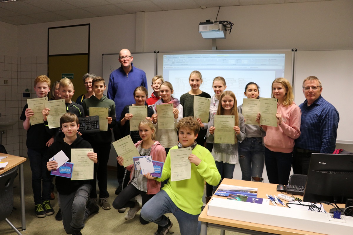 Mit außerordentlichem Erfolg haben die Schülerinnen und Schüler der Stufe 7 den ersten Computertastschreibkurs in diesem Schuljahr abgeschlossen. Innerhalb von 12 Nachmittagen erlernten Emma, Johanna, Lorena, Peter, Linus, Max, Milo, Viola, Paul, Angelina, Fiona, Janne, Katharina und Simon das Zehnfingersystem und können fortan am Computer arbeiten, ohne weiter auf die Tastatur zu schauen.