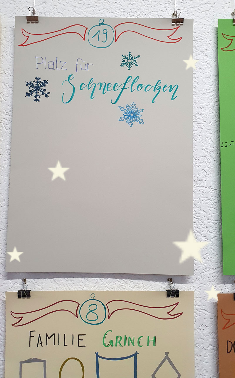 Auch in diesem Jahr hat die Kunst-Fachschaft einen ganz besonderen Adventskalender für die Schulgemeinschaft vorbereitet. Der Clou in diesem Jahr ist, dass jeder von euch an dem Kalender mitwirken kann. An jedem Tag gibt es eine kleine Aufgabe, die ihr direkt auf dem jeweiligen Plakat umsetzen könnt. Dabei müsst ihr euch nicht an eine Reihenfolge halten. Bringt gerne Buntstifte und Bleistifte mit und werdet direkt auf den Kalenderblättern kreativ oder zeichnet zuhause oder in der Pause und klebt eure Kunstwerke einfach auf das entsprechende Türchen.