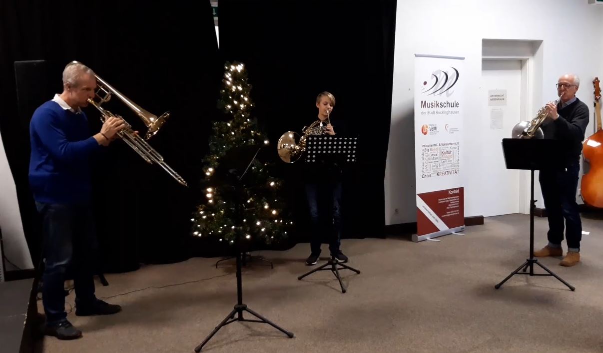 In dieser Corona-Adventszeit begeistert die Musikschule täglich über Facebook mit einem Video ihres musikalischen Adventskalenders. Hinter dem sechsten Türchen am Festtag des Hl. Nikolaus wartete erneut Nils Thurau aus der 09C des Gymnasium Petrinum am Horn. Unterstützt wurde er wiederum von den Musikschullehrern Thomas Tirler an der Posaune und Günther Kahlenbach am Horn, die beide auch in unseren Bläserklassen in Kooperation mit der Musikschule unterrichten.