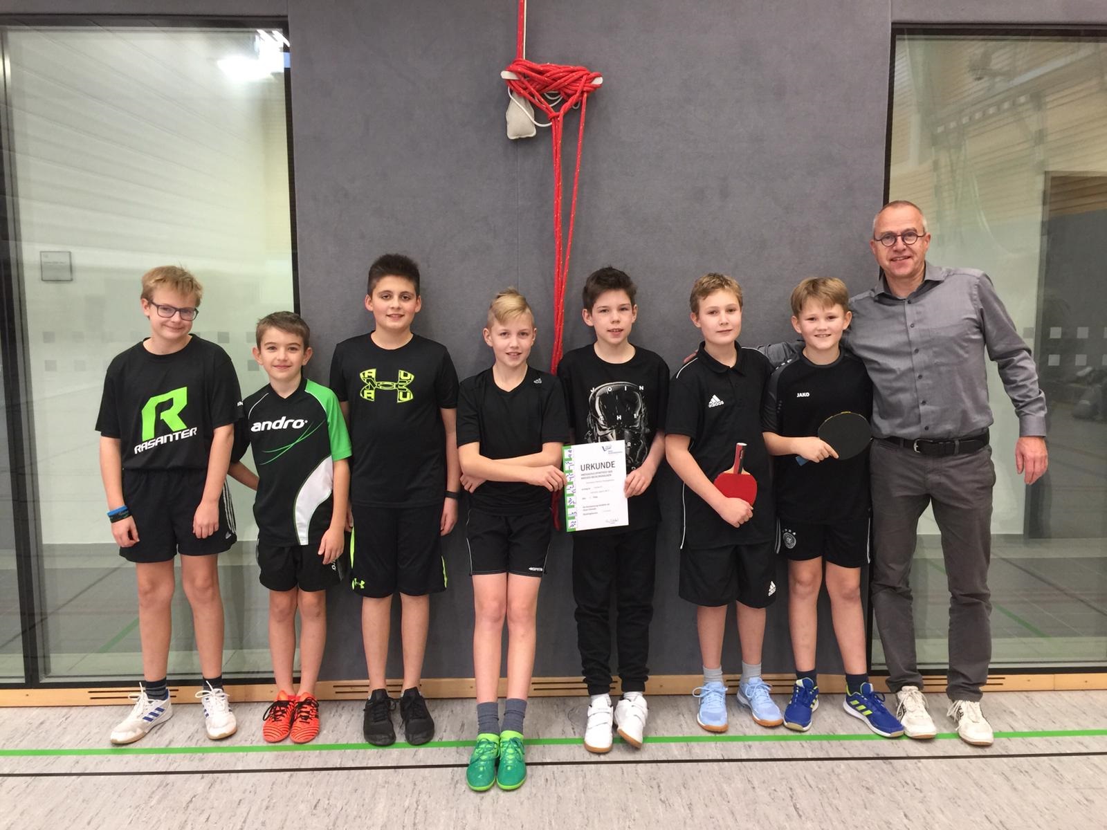 Im Finale der Kreismeisterschaft setzte sich die von Trainer Armin Pohlmann betreute Tischtennis-Mannschaft des Petrinum in einem spannenden Duell gegen das Team des Hittorf-Gymnasiums mit 5:4 durch. Damit gelang der Mannschaft um (auf dem Foto von links nach rechts) Chris Andersen, Hugo Ertmer, Nick Röhl, Paul Mebus, Jonath Scholz, Florian Solf und Till Hemeier gemeinsam mit Trainer Armin Pohlmann die Titelverteidigung nach dem erstmaligen Erfolg als Kreismeister im vergangenen Jahr. Herzlichen Glückwusnch zu dieser erneut tollen Mannschaftsleistung!