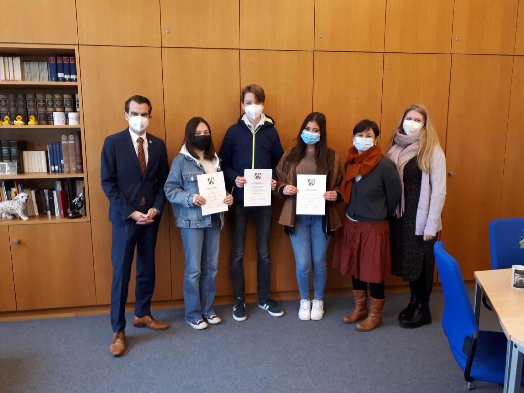 Auch in diesem Schuljahr haben Schülerinnen und Schüler unserer Schule mit Erfolg und besonderem Erfolg am Philosophischen Essaywettbewerb teilgenommen. Esmanur Kanoglu, Rita Voroshilova und Emil Wagner aus der Stufe EF und Lydia Hoffmeister (nicht auf dem Foto) aus der Stufe Q2 wurden von der Jury ausgezeichnet.