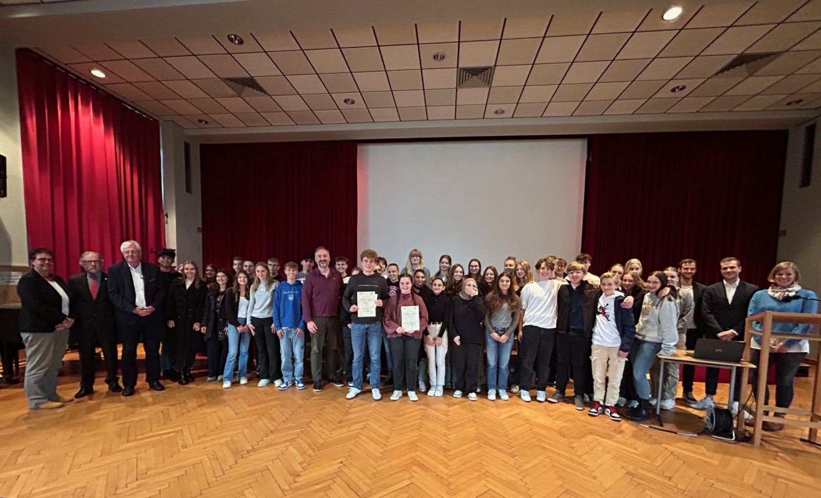Darüber hinaus wurde der Schulsanitätsdienst des Gymnasium Petrinum für jahrelange besondere schulbezogenen Leistungen ausgezeichnet. Seit mittlerweile elf Jahren werden regelmäßig durch Mitarbeiterinnen und Mitarbeiter der Malteser Recklinghausen Schülerinnen und Schüler ab der Jahrgangsstufe 8 zu Schulsanitäterinnen und Schulsanitätern ausgebildet. Auf dieser Basis leisten sie körperliche und seelische Erste-Hilfe bei größeren Schulveranstaltungen, wie dem Reike-Pokal oder dem Sportfest, sowie bei Verletzungen und Unfällen im schulischen Alltag. Victoria Peiler aus der Klasse 10 berichtete stellvertretend für die über 30 Aktiven von den vielen Erlebnissen und Eindrücken, die ihre Ausbildung und Arbeit im Schulsanitätsdienst ausmachen und die sie nicht missen möchte: „Ich fühle mich durch die Ausbildung und die praktischen Erfahrungen im Alltag sicherer, weil ich nun weiß, was in Notfällen zu tun ist. Ich muss im Notfall nicht ängstlich oder unsicher sein, sondern kann reagieren und Ersthilfe leisten. Das ist ein gutes Gefühl.“ In ihrer Laudatio dankten die betreuenden Fachlehrkräfte, Sebastian Terhorst und Nina Gelleschun, den aktiven Schülerinnen und Schülern ebenso wie ihrem Vorgänger im Amte, Dr. Wolfgang Polleichtner, der den Schulsanitätsdienst im Jahr 2012 ins Leben gerufen hat, sowie den Maltesern Recklinghausen, die als verlässlicher Kooperationspartner von ersten Tag an dabei waren und sich seitdem jährlich in der Ausbildung und Begleitung der Schulsanitäterinnen und -sanitäter engagieren. Jan Zühlke, der die Ausbildung auf Seiten der Malteser koordiniert, war selbst bei der Feierstunde zugegen und dankte den Schülerinnen und Schülern für den Einsatz, den sie im Schulsanitätsdienst zeigen. Für die Malteser Recklinghausen sei es eine Freude, so viel ehrenamtliches Engagement jährlich immer wieder aufs Neue miterleben und begleiten zu dürfen.