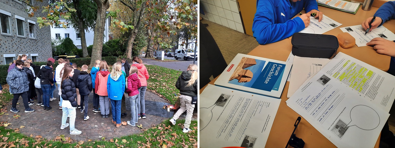 Gleichzeitig erkundeten die Schülerinnen und Schüler der Stufe 6 ihre eigene schulische Umgebung, denn vom Petrinum aus war die in der Nacht auf den 10. November beschädigte Synagoge durchaus zu sehen. Im Jahre 1938 sprachen weder Lehrkräfte noch Schüler über das, was sich in der Nacht ereignet hatte, dass jüdische Geschäfte beschädigt, Häuser geplündert, jüdische Männer durch die Straßen getrieben und verhaftet, auf dem Vorplatz des Polizeipräsidiums gedemütigt worden waren – „der Unterricht ging pünktlich weiter“. Der Gang zum ehemaligen Standort der Synagoge in der Limperstraße und der Blick über die Straßenzüge „hat etwas mit mir gemacht. Ich fand es krass dort zu stehen, wo die Menschen so leiden mussten – und das mitten in der Stadt und keiner hat geholfen, das fand ich schlimm“, resümiert eine Schülerin. „Es ist ganz schön traurig, dass heute noch die Polizei vor den Synagogen stehen muss“, bemerkt ein Schüler während des weiteren Weges entlang des Herzogswalles, als die Klassen das Mahnmal jüdischer Opfer des Nationalsozialismus passieren. Schließlich fasst eine Stimme aus den Reihen der Sechstklässler zusammen: „Vorher habe ich nichts gewusst über diese Zeit in Deutschland, aber ich nehme mit, dass es ganz wichtig ist, darüber zu sprechen und nichts zu vergessen. Nun wissen wir Bescheid und können andere informieren, damit so etwas wie mit den Juden nie wieder passiert. Ich will nichts vergessen von dem Tag heute.“