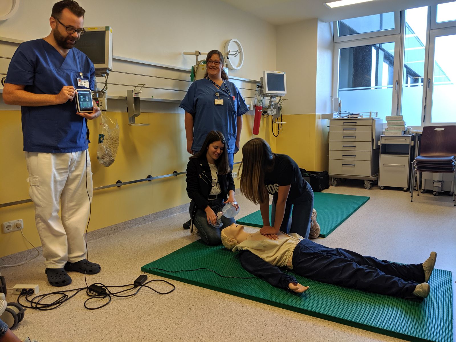 ... so lautet der Slogan der Initiative aus Anästhesisten und Intensivmedizinern, die den neunten Klassen in der letzten Woche in der Schule, sowie auch auf der Intensivstation des Prosper Hospitals die Unsicherheit zum Ersthelfen nahmen. Das Team um Johannes Meier (Abitur 2008, Gymnasium Petrinum) informierte die Stufe 9 zunächst mit einem sehr anschaulichen Vortag über die Problematik eines Herzstillstandes und nahm anschließend den Schülern die Berührungsangst in einer Notfallsituation in der Praxis in Kleingruppen. An computergesteuerten Reanimationspuppen konnte die Herzdruckmassage bei Klängen von „Call me Maybe“ und „Highway to Hell“ ausprobiert, korrigiert und auch diskutiert werden. Das Team gab Tipps und ermunterte die Schüler, auch bei fremden Menschen in Not, es einfach zu versuchen. Die Hauptsorge der Schüler bestand darin, dass Rippen brechen könnten, doch auch hier konnte das Team beruhigen. Manchmal ist es sogar besser, wenn das passiert und besser eine gebrochene Rippe, als der worst case.