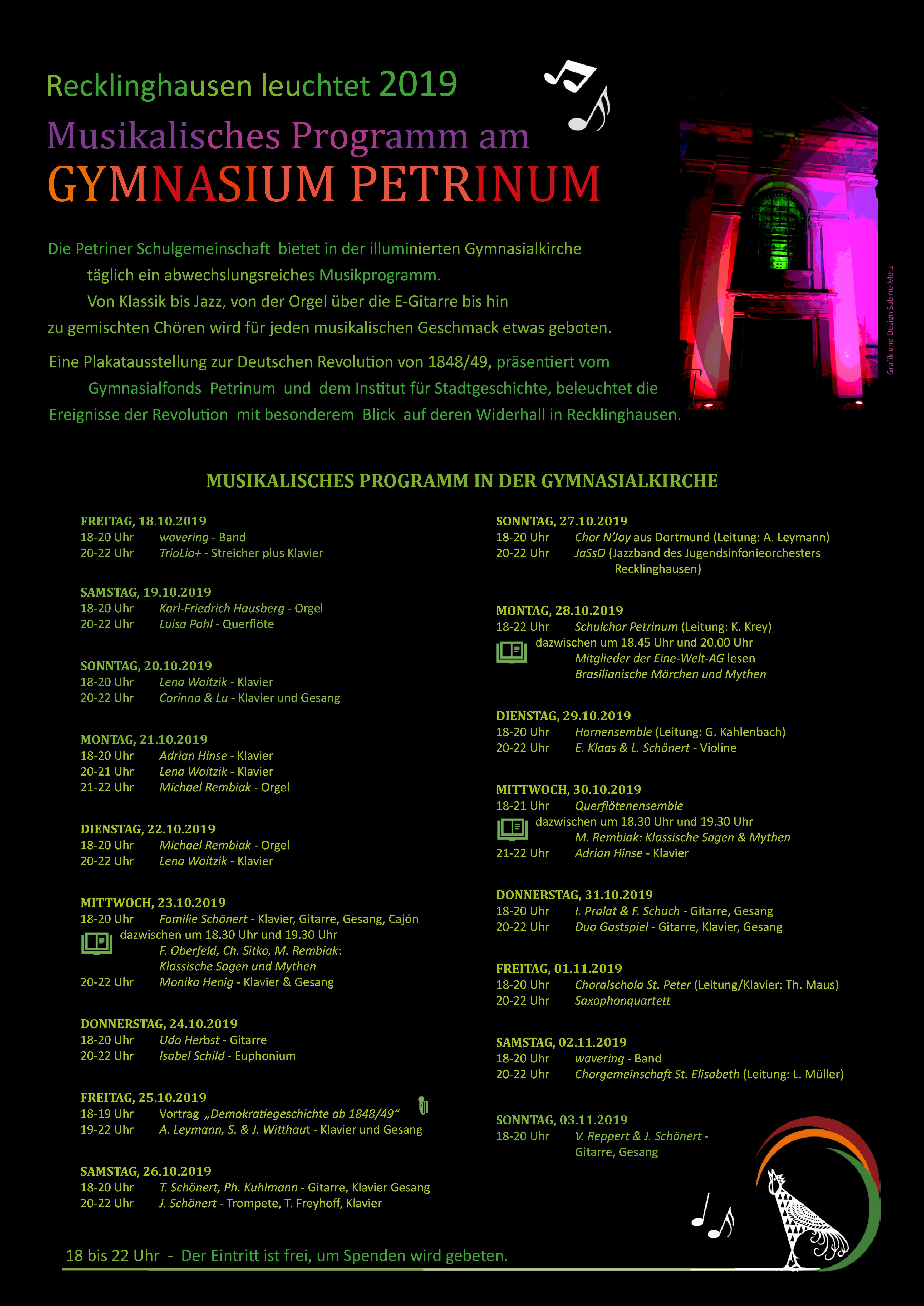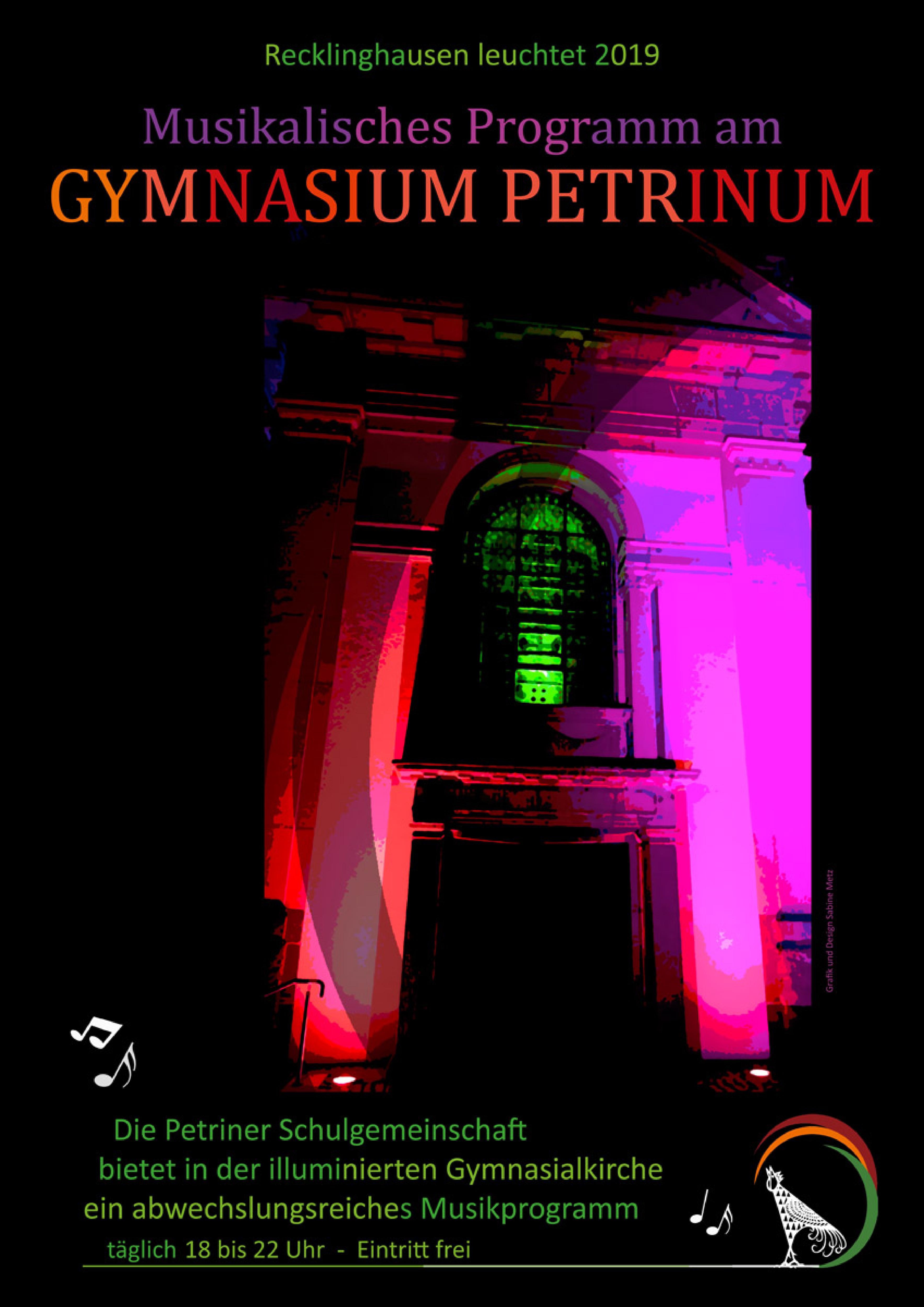 Die Petriner Schulgemeinschaft bietet in der illuminierten Gymnasialkirche während "Recklinghausen leuchtet 2019" täglich von 18.00 bis 22.00 Uhr ein abwechslungsreiches Musikprogramm. Von Klassik bis Jazz, von der Orgel über die E-Gitarre bis hin zu gemischten Chören wird für jeden musikalischen Geschmack etwas geboten.