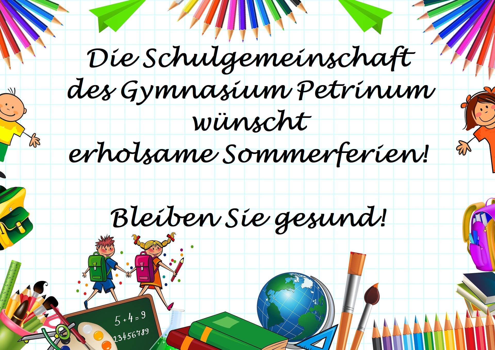 Ich wünsche der gesamten Schulgemeinschaft des Gymnasium Petrinum, allen Familien, Ehemaligen, Freunden und Bekannten erholsame Sommerferien! Ich freue mich auf ein Wiedersehen zum Start in ein hoffentlich weitgehend von Corona-Eskapaden verschontes neues Schuljahr 2021/22 am Mittwoch, 18.08.2021. Bis dahin: