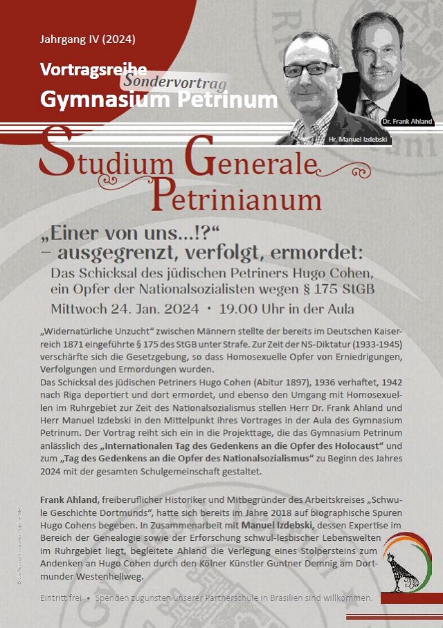 „Widernatürliche Unzucht“ zwischen Männern stellte der bereits im Deutschen Kaiserreich 1871 eingeführte § 175 StGB unter Strafe. Zur Zeit der NS-Diktatur (1933-1945) verschärfte sich die Gesetzgebung, so dass Homosexuelle Opfer von Erniedrigungen, Verfolgungen und Ermordungen wurden. Das Schicksal des jüdischen Petriners Hugo Cohen (Abitur 1897) und den Umgang mit Homosexuellen im Ruhrgebiet zur Zeit des Nationalsozialismus stellen Herr Dr. Frank Ahland und Herr Manuel Izdebski in den Fokus ihres Sondervortrags. Der Vortrag reiht sich ein in die Projekttage, die das Gymnasium Petrinum anlässlich des „Internationalen Tag des Gedenkens an die Opfer des Holocaust“ und zum „Tag des Gedenkens an die Opfer des Nationalsozialismus“ 2024 mit der gesamten Schulgemeinschaft gestaltet.