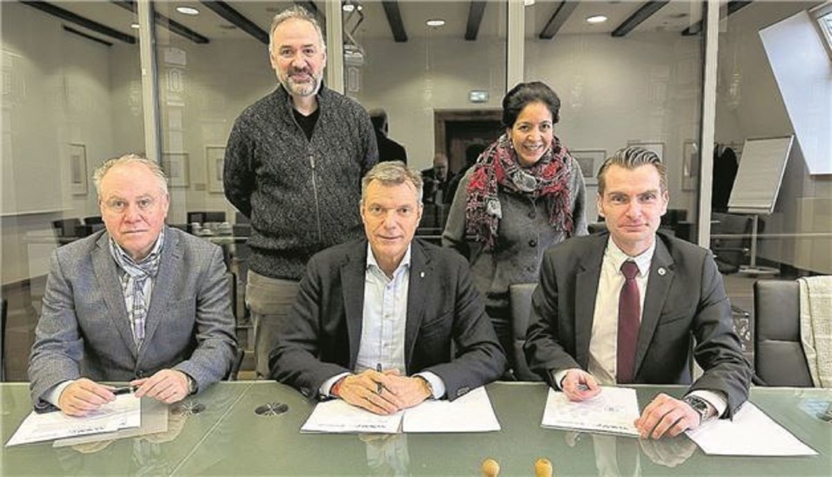 Pressefoto: Die Bildungspartnerschaft ist unterzeichnet (vorne von links): Stadtarchivar Matthias Kordes, Bürgermeister Christoph Tesche, Schulleiter Michael Rembiak, (hinten von links) Geschichtslehrer Dr. Marco Zerwas und Geschichtslehrerin Gesa Sebbel. Foto: Stadt RE