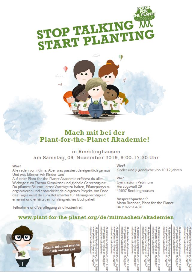 Alle reden vom Klima. Aber was passiert da eigentlich genau? Und was können wir Kinder tun? Auf einer Plant-for-the-Planet Akademie erfährst du alles Wichtige zum Thema Klimakrise und globale Gerechtigkeit. Du pflanzst Bäume, lernst Vorträge zu halten, Pflanzpartys zu organisieren und entwickelst dein eigenes Projekt. Am Ende des Tages wirst du zum Botschafter für Klimagerechtigkkeit ernannt und erhältst ein umfangreiches Buchpaket! Die nächste Plant-for the-Planet Akademie findet am Samstag, 09. November 2019 in Recklinghausen statt. Das Petrinum wird Gastgeber der Veranstaltung sein, eingeladen sind alle Jugendlichen aus Recklinghausen im Alter von 10-12 Jahren. Die Teilnahme und Verpflegung an diesem Tag werden kostenlos sein. Die Online-Anmeldung ist bis zum 01. November 2019 auf folgender Seite möglich: