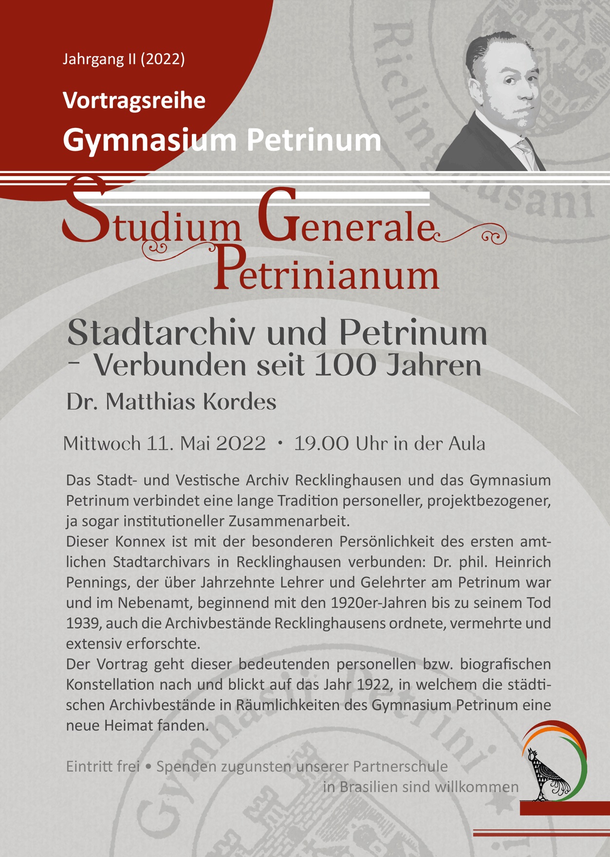 die Stadtgeschichte Recklinghausens im Fokus der stehen. Herr Dr. Matthias Kordes vom Institut für Stadtgeschichte Recklinghausen wird zum Thema „Stadtarchiv und Petrinum - Verbunden seit 100 Jahren“ referieren. Das Stadt- und Vestische Archiv Recklinghausen und das Gymnasium Petrinum verbindet eine lange Tradition personeller, projektbezogener, ja sogar institutioneller Zusammenarbeit. Dieser Konnex ist mit der besonderen Persönlichkeit des ersten amtlichen Stadtarchivars in Recklinghausen verbunden: Dr. phil. Heinrich Pennings, der über Jahrzehnte Lehrer und Gelehrter am Petrinum war und im Nebenamt, beginnend mit den 1920er-Jahren bis zu seinem Tod 1939, auch die Archivbestände Recklinghausens ordnete, vermehrte und extensiv erforschte. Der Vortrag geht dieser bedeutenden personellen bzw. biografischen Konstellation nach und blickt auf das Jahr 1922, in welchem die städtischen Archivbestände in Räumlichkeiten des Gymnasium Petrinum eine neue Heimat fanden.