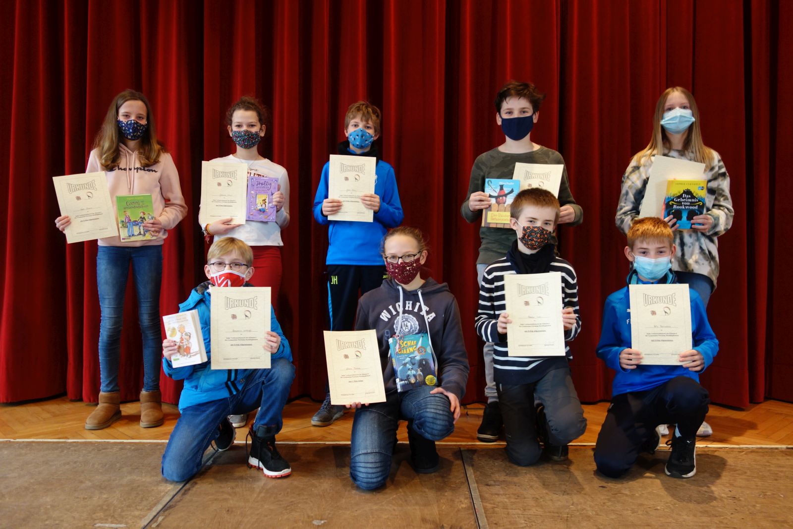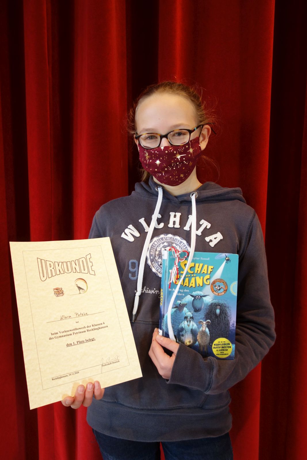 Es war eine große Freude, den unterhaltsamen Darbietungen der neun Schülerinnen und Schülern der Jahrgangsstufe 6 zuzuhören. Deswegen war es für die Jury umso schwerer, zu entscheiden, welcher der tollen Beiträge denn nun der beste war. Unsere diesjährige Siegerin, Klara Putzke aus der Klasse 6a, überzeugte mit einem ausgezeichnet interpretierten Auszug aus Christine und Christopher Russels Jugendbuch „Die Schafgäääng“. Souverän gab Klara die Erlebnisse der Schafsherde wieder: Nachdem ein geheimnisvoller „Mähteorit“ aus dem Himmel direkt auf die Herde geflogen kommt, ist klar, dass dies ein Zeichen des Widder-Gottes sein muss. Wild entschlossen macht sich die Herde auf den Weg zum Schafsgott und gerät dabei in eine spannende Verfolgungsjagd.