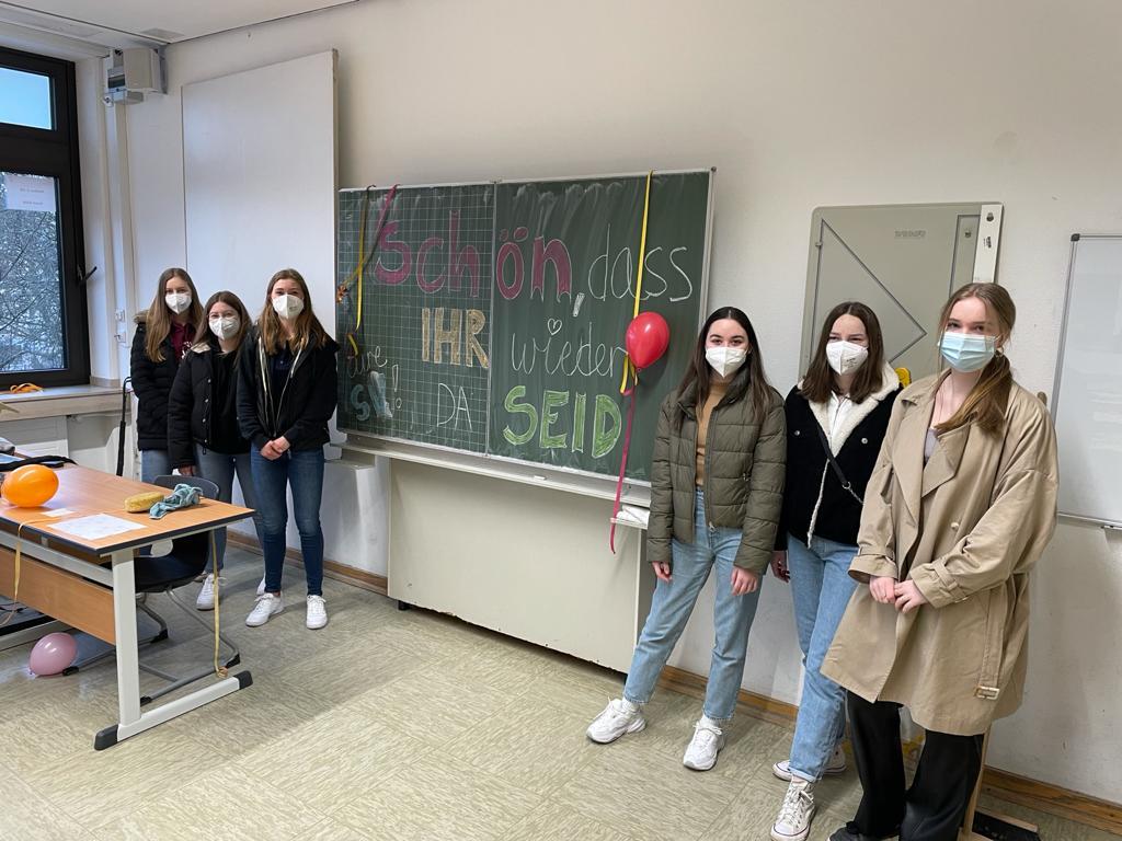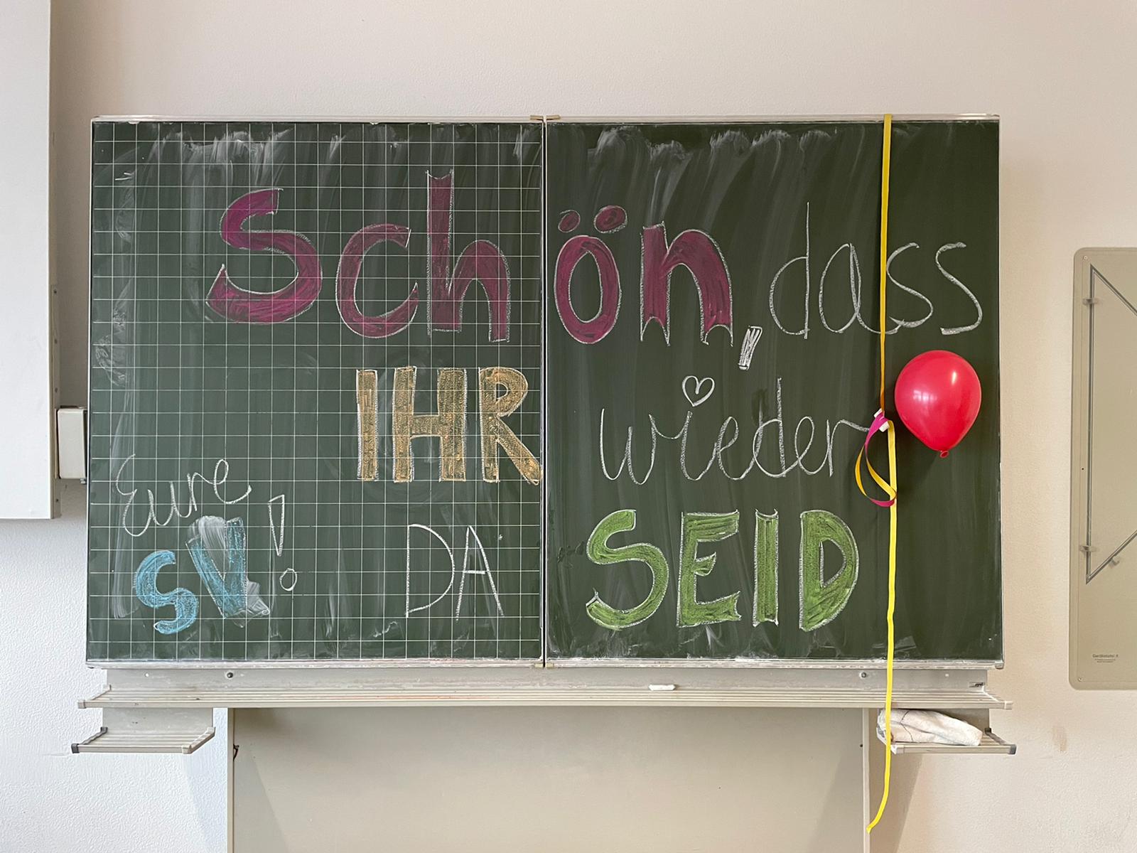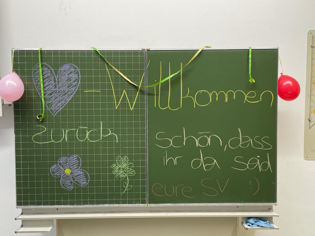 Nachdem die Q1 und Q2 bereits vor drei Wochen in den Präsenzunterricht zurückkehren durfte, ist nun der erste Teil der Stufe 5 bis EF wieder in der Schule. Die SV begrüßte die Jüngsten aus der Schulgemeinschaft mit einem kleinen Willkommensgruß an der Tafel und einem bunt geschmückten Klassenraum.