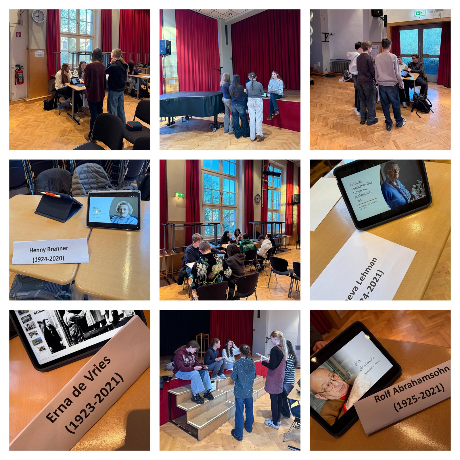 Mithilfe des Online-Angebotes des Vereins „Zweitzeugen e.V.“ haben sich die Schülerinnen und Schüler der Stufe 9 die Geschichten von Zeitzeuginnen und Zeitzeugen, die den Holocaust und damit die Gräueltaten der Nationalsozialisten überlebt haben, angeeignet. Ebenfalls war es zentrales Ziel des Projekttages, diese Geschichten in kleinen Präsentationen aufzubereiten und sie von den Neuntklässlern in einer Begegnung mit der Stufe 7 weiterzutragen. Anfang Februar war es nun soweit, dass die Jugendlichen als Expert:innen für Rolf Abrahamsohn, Henny Brenner, Erna de Vries und Elisheva Lehmann auftraten, um den Jüngeren das Überleben der vier Menschen nahe zu bringen, im Gespräch die einzelnen Schicksalsschläge zu reflektieren, aufrechte Haltungen gegen einen menschenverachtenden Umgang zu entwickeln und zu berichten, welche positiven Charaktereigenschaften der Verfolgten die Neuntklässler am meisten – auch für unsere Gegenwart – beeindruckt haben. In der Begegnung mit dem Geschichtsleistungskurs der Stufe Q1 kam es ebenfalls zu einem regen und interessierten Austausch, so dass die älteren Schüler:innen wie auch die Siebtklässler sowohl „Briefe gegen das Vergessen“ an die Nachkommen der Überlebenden verfassten, als auch künftig als erneute Zweitzeug:innen die Geschichten gegen das Vergessen werden weitererzählen können.